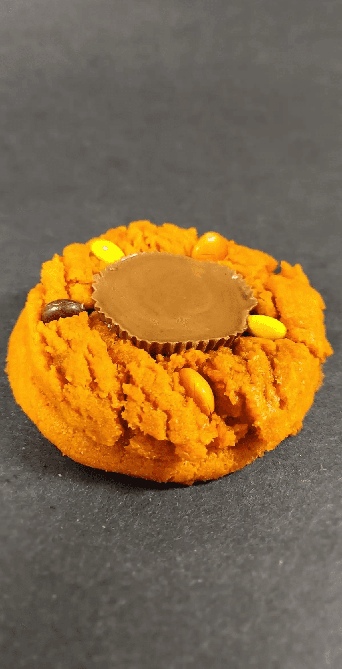 A rich cookie topped with a peanut butter cup and adorned with colorful candy-coated chocolates.